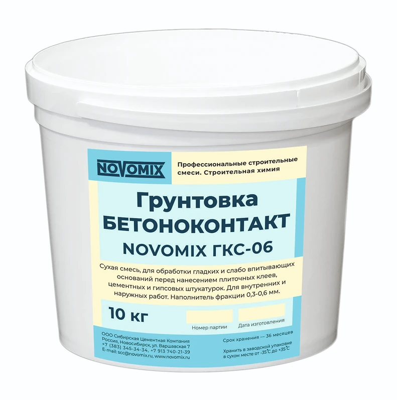 Применение. Грунтовка Бетонконтакт Novomix предназначена для обработки гладких слабо впитывающих оснований стен из монолитного или сборного железобетона перед нанесением плиточных клеев, цементных и гипсовых штукатурок. Для внутренних и наружных работ. Благодаря зернистой структуре, придает обработанным поверхностям шероховатость и обеспечивает высокую адгезию наносимых материалов к основаниям. Производится в виде сухой смеси, перед применением затворяется водой до сметанообразной консистенции. Наполнитель – фракция 0,3-0,6 мм.