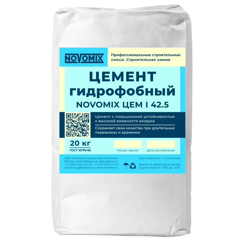 Описание. Гидрофобный портландцемент марки 500 NOVOMIX содержащий в составе гидрофобизующую поверхностно-активную добавку.